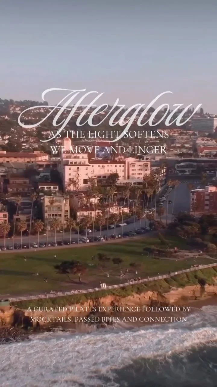 Afterglow at The Whaling Bar is a golden hour Pilates & mocktails experience at La Valencia Hotel, featuring chef-curated passed appetizers and signature mocktails. Limited spots available, an extra special surprise awaits at your mat.